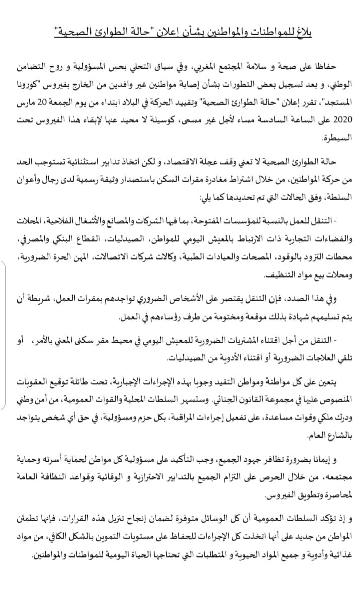 بلاغ لوزارة الداخلية فيروس كورونا المستجد: إعلان حالة الطوارئ الصحية وتقييد الحركة في البلاد ابتداء من يوم غد الجمعة على الساعة السادسة مساء لأجل غير مسمى كوسيلة لا محيد عنها لإبقاء هذا الفيروس تحت السيطرة.